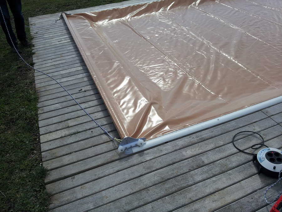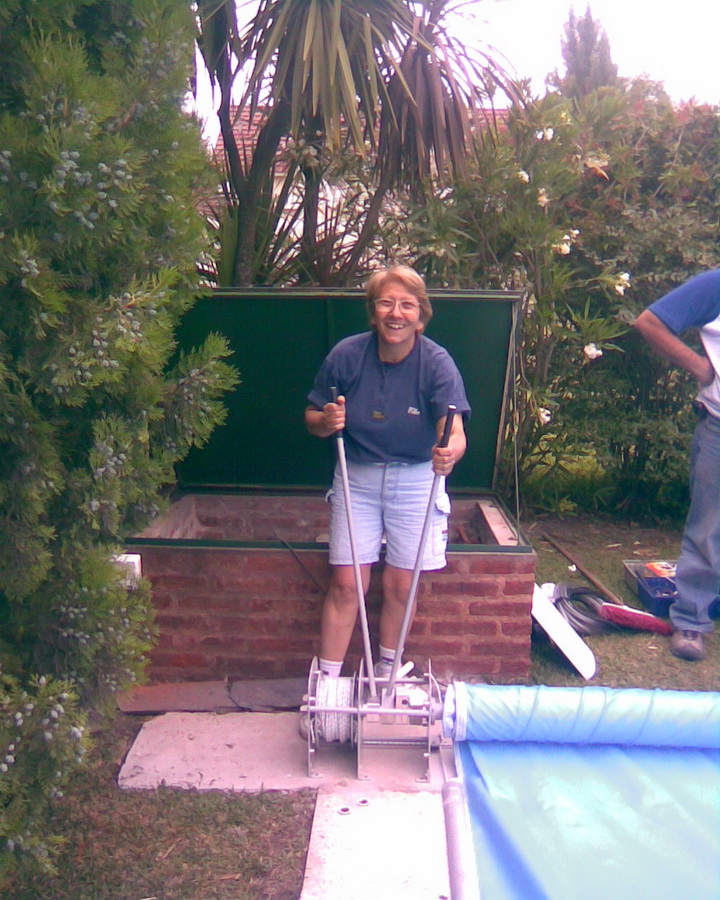 Todas nuestras cubiertas estan equipadas con una bomba especialmente diseñada para cubiertas de piscina. Esta bomba desagota automaticamente el agua de lluvia que pueda acumularse sobre la misma.
